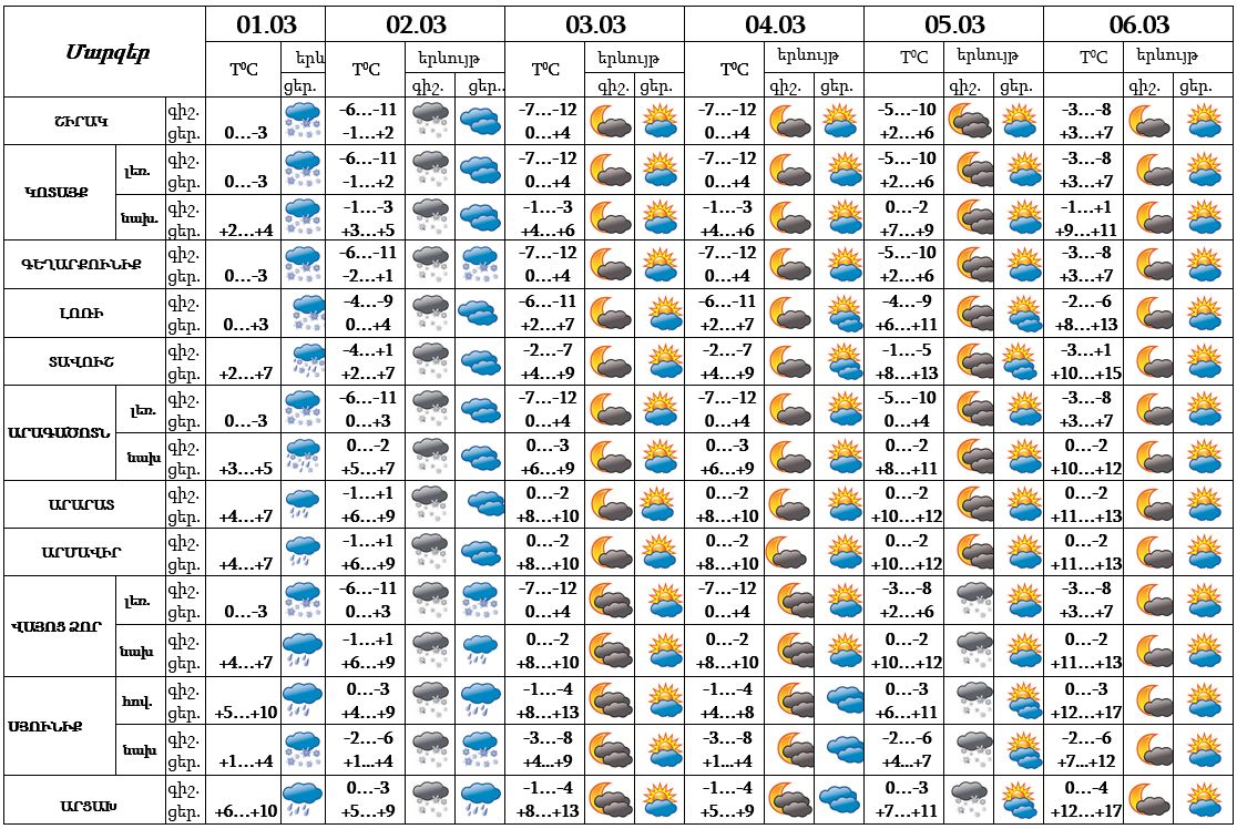 Մարտի 1-ի ցերեկը, 2-ի գիշերը շրջանների զգալի մասում, 2-ի ցերեկը առանձին շրջաններում, 5-ի գիշերը Վայոց ձորում, Սյունիքում և Արցախում ժամանակ առ ժամանակ սպասվում են տեղումներ, լեռնային և նախալեռնային շրջաններում՝ ձյան տեսքով։