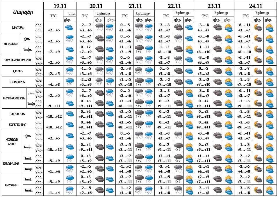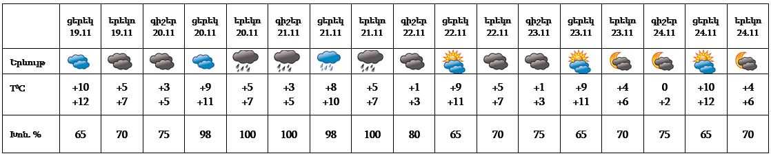 Նոյեմբերի 19-ի ցերեկը, 22-24-ը սպասվում է առանց տեղումների եղանակ, 20-ի երեկոյան ժամերին, 21-ին սպասվում է անձրև։