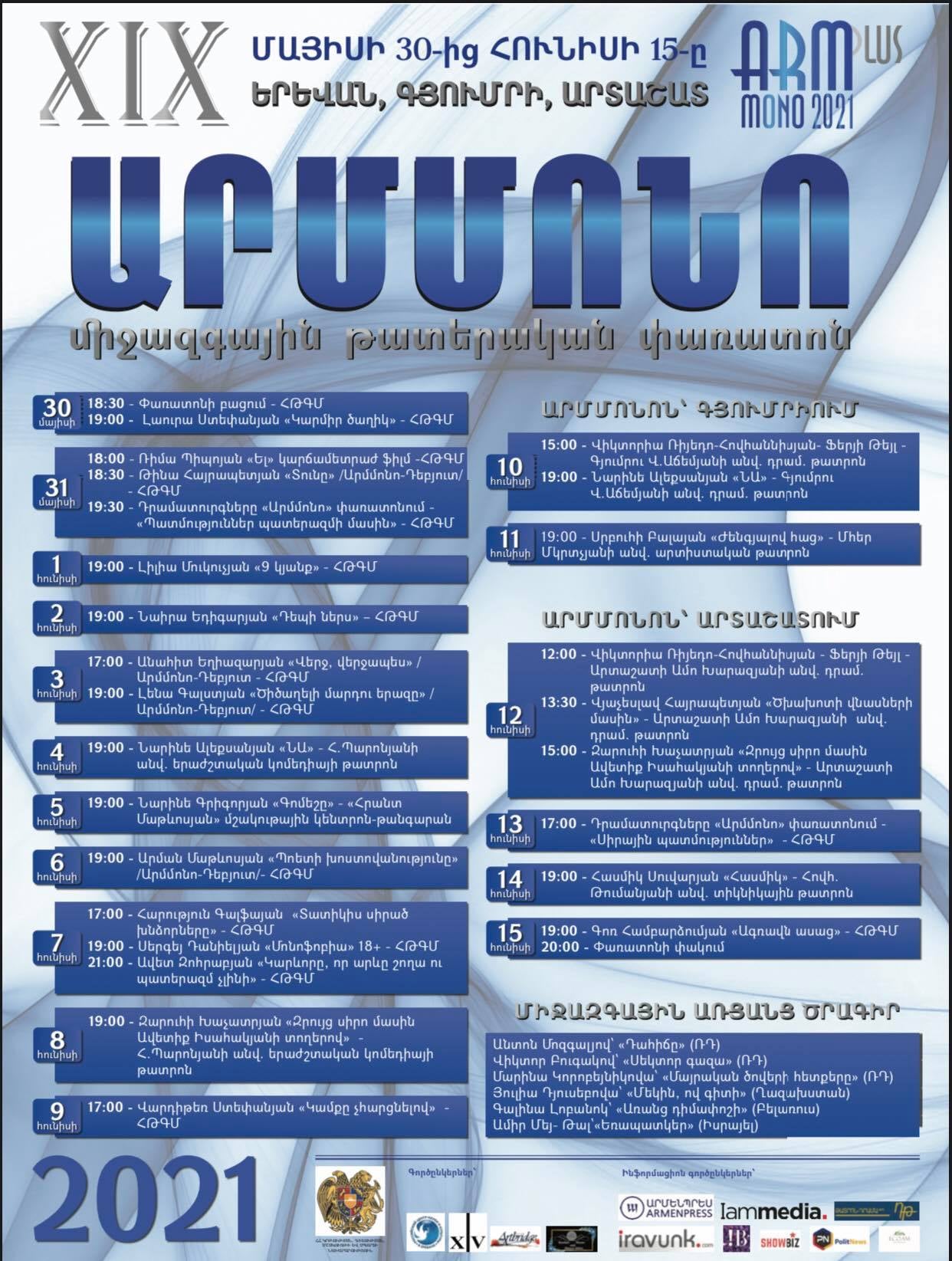 Փառատոնի ներկայացումների ժամանակացույցին կարող եք ծանոթանալ հետևյալ հղումով․ http://armmono.com/guests/321–2021.html